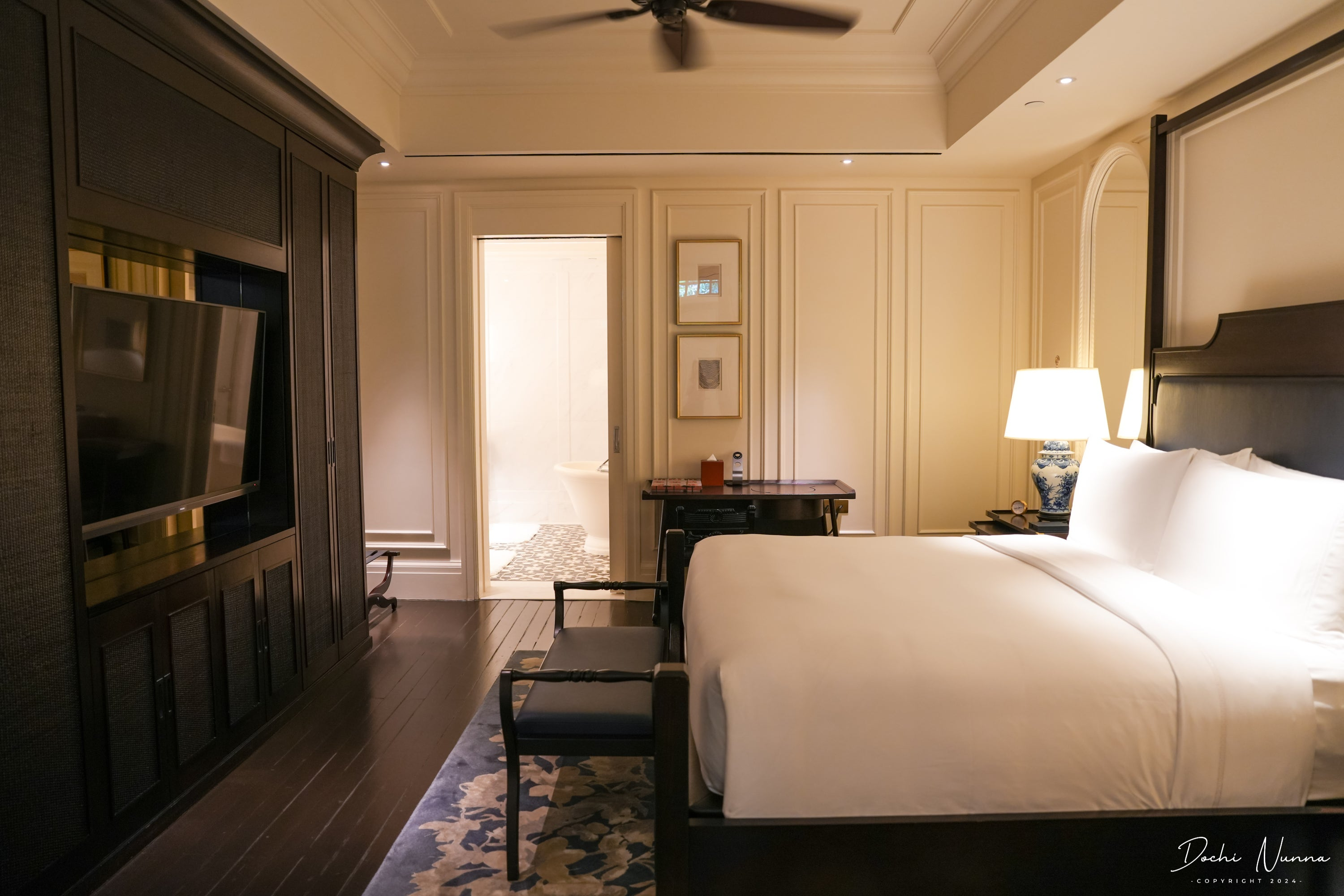 Furnished simply with a massive, cloud-like bed, a TV, and a writing desk,