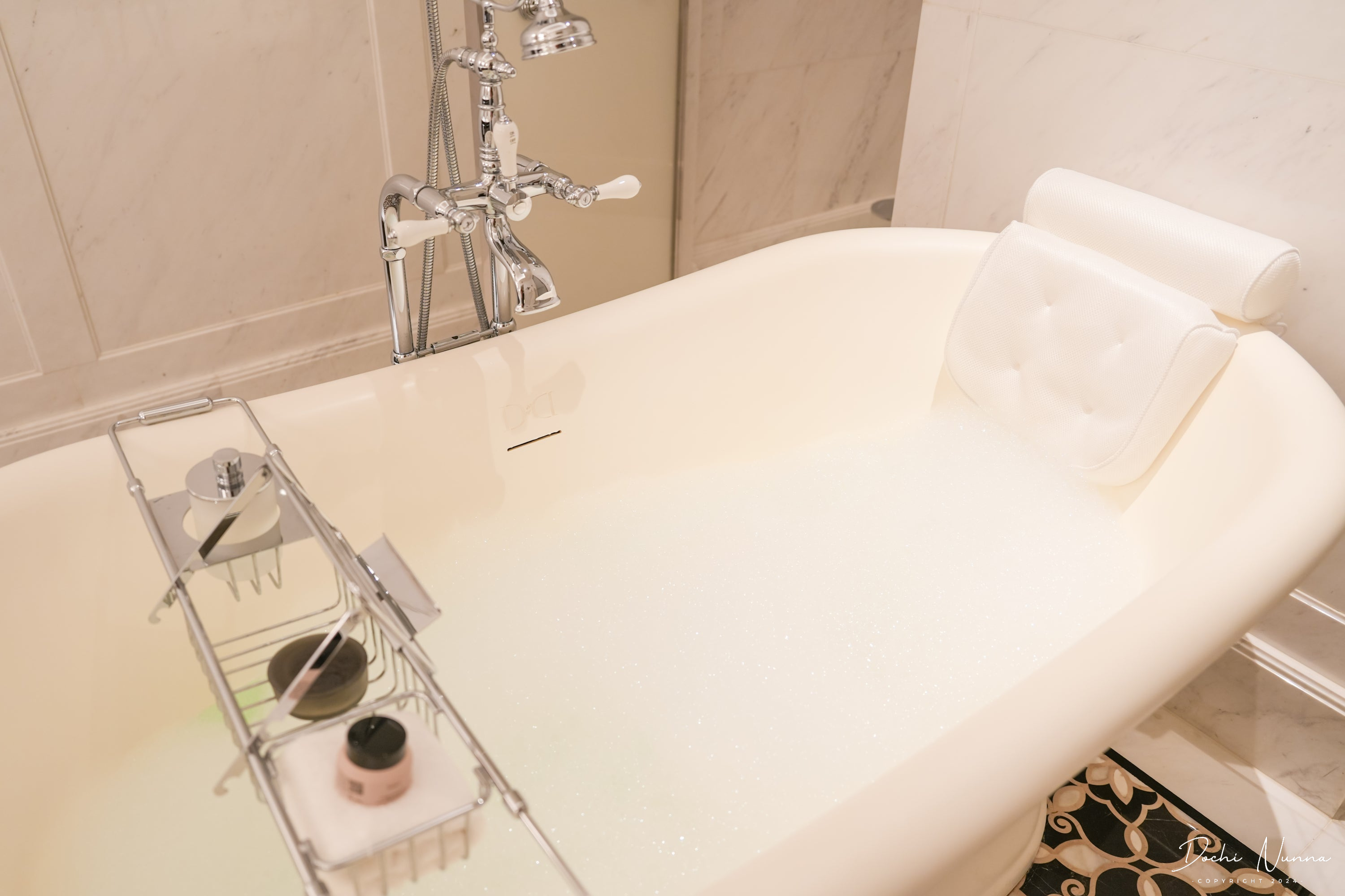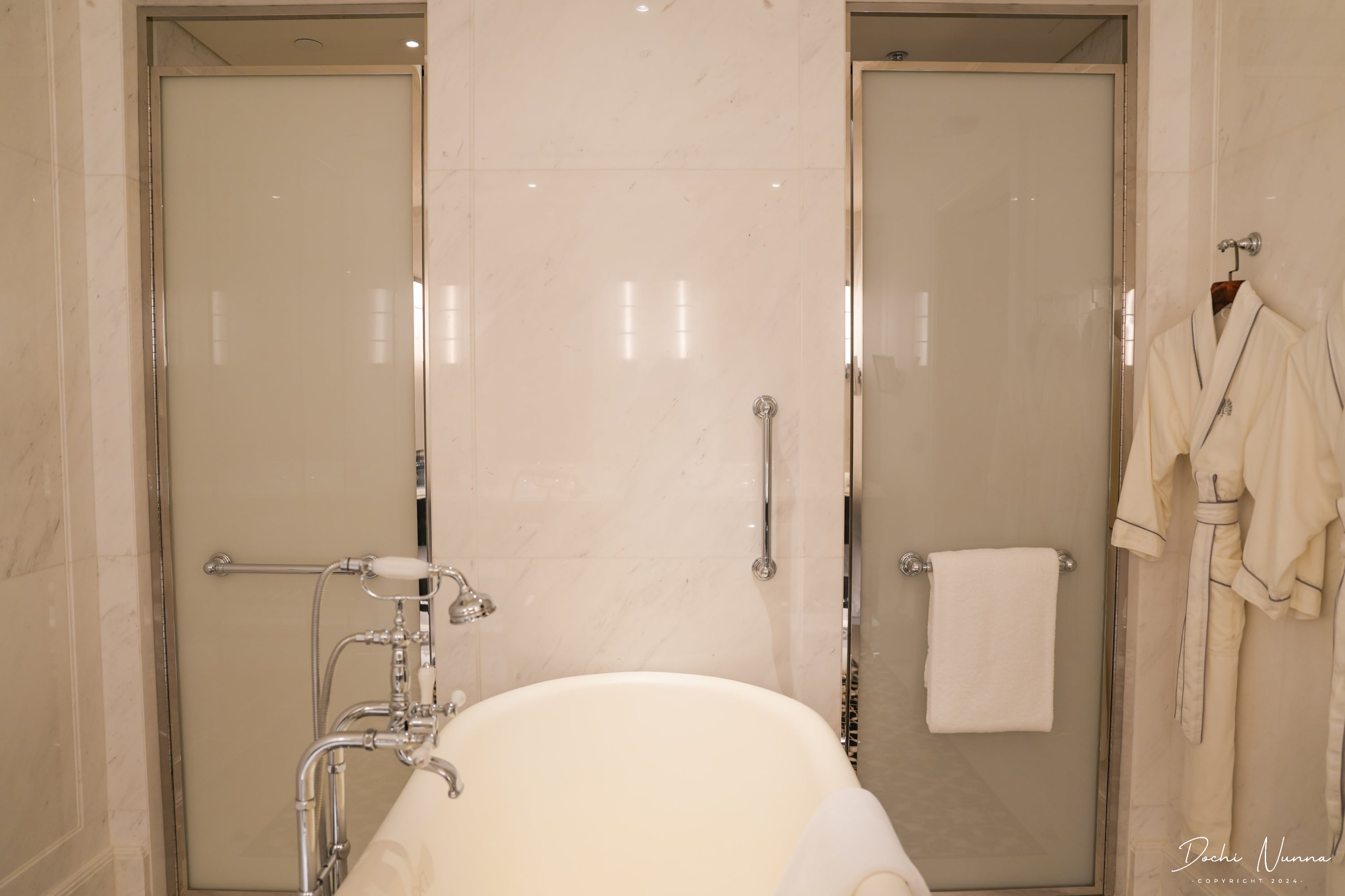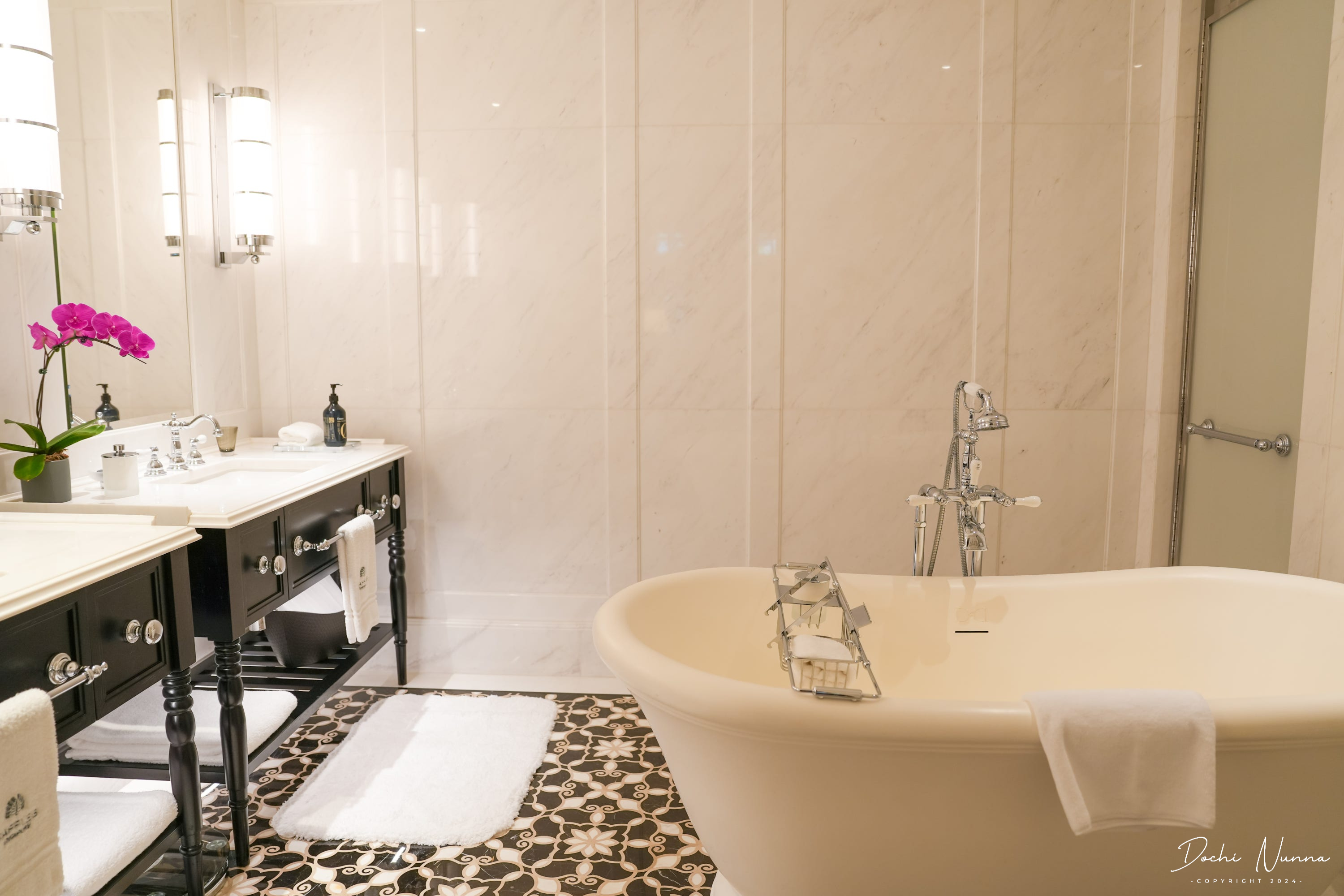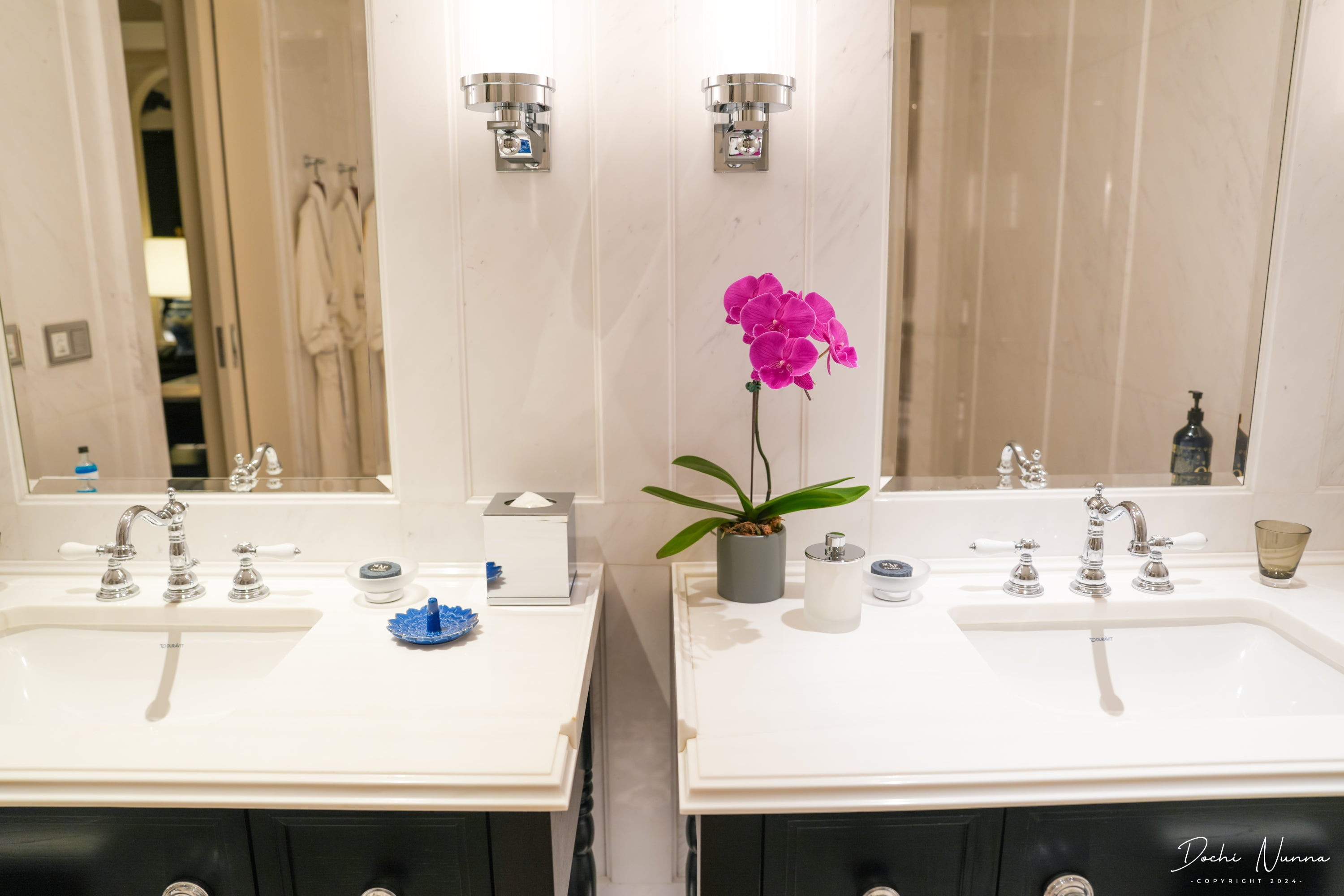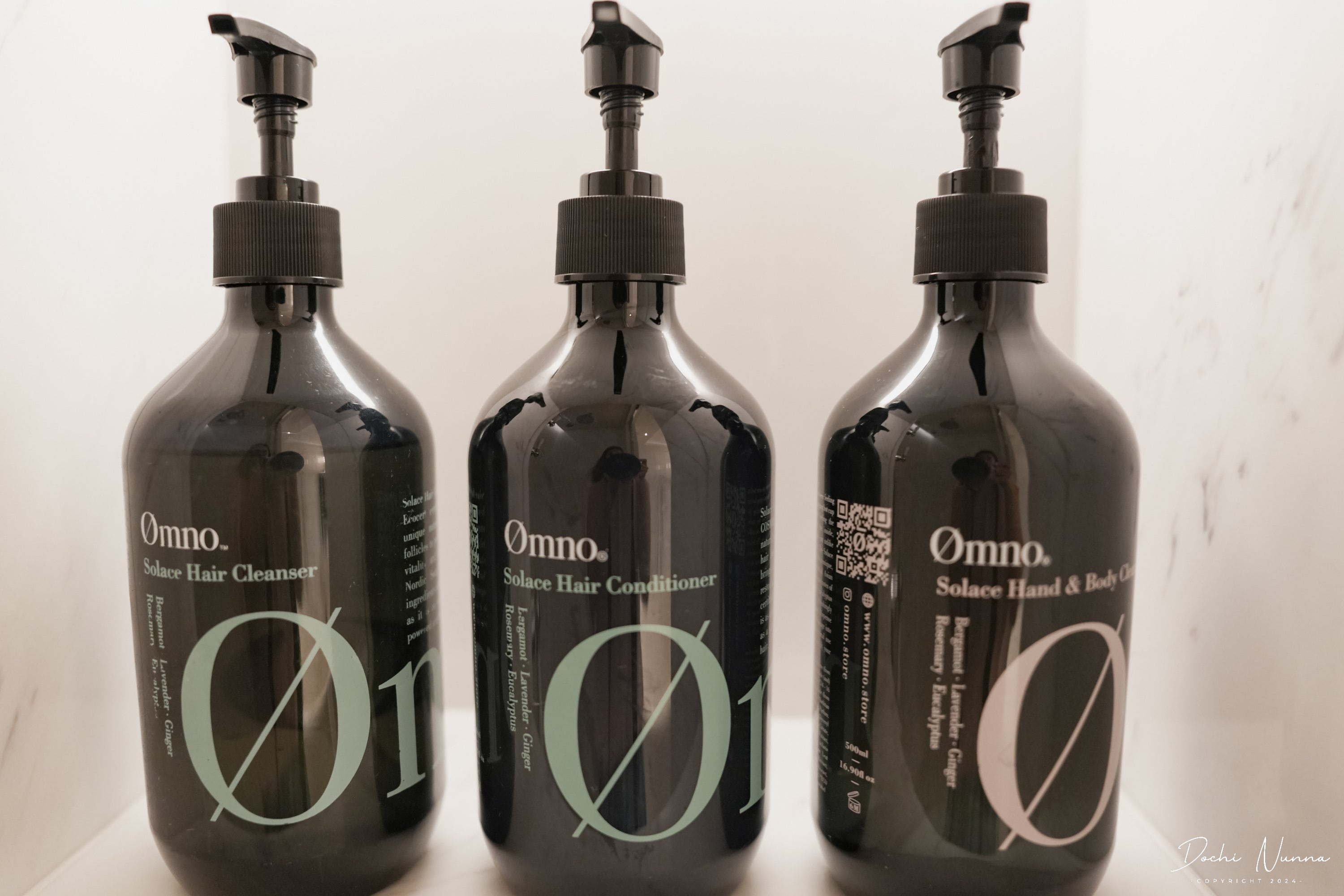 High-end amenities like shampoo, conditioner, and body wash are perfectly placed,