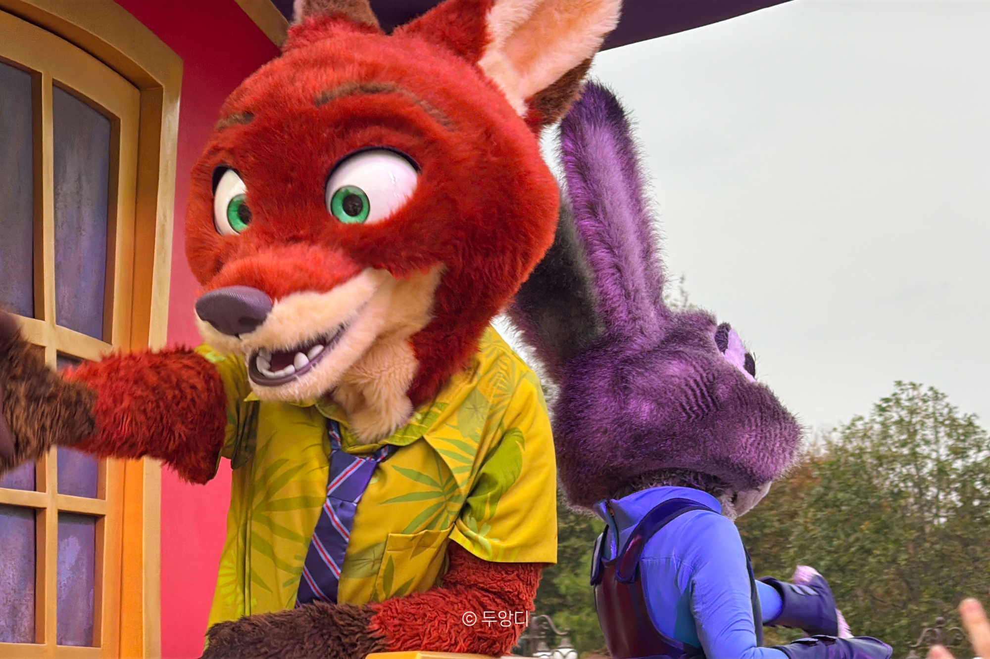 私が一番楽しみにしていたズートピアの主人公、ニックとジュディ。大人気の2人なので、一緒にグリーティング(写真撮影)をするにはなんと2時間待ちでした(笑)