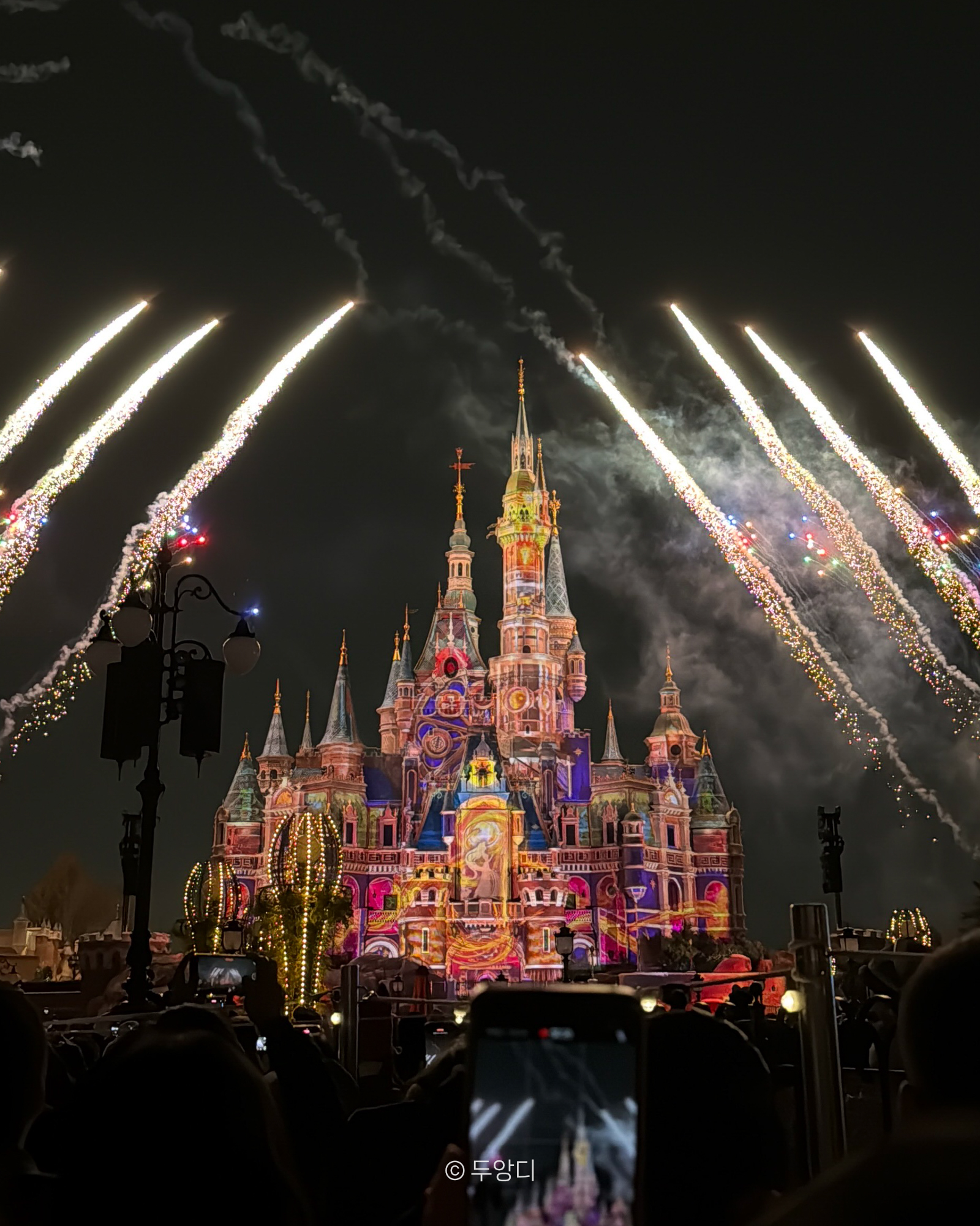 単なる花火大会を想像していたのですが、お城全体を使った色鮮やかなプロジェクションマッピング、噴水、光、そして花火がシンクロする圧巻のエンターテインメントでした。想像の1000倍素晴らしくて、思わず涙が出そうに…。1時間待ってでも見る価値は絶対にあります!普段ショーにあまり興味がない夫も、大絶賛していました。